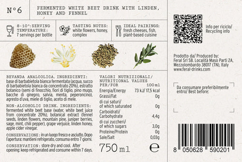 fermented white beet base (water, white beet juice from concentrate 20%), botanical extract (fennel seeds, linden flowers, mountain pine, juniper berries, sage, mint, chili pepper), grape verjuice, linden honey, apple cider vinegar.
